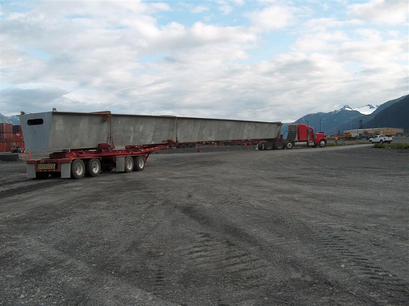 Project: Soldotna, Kenai River Bridge Client: Wilder Construction Transport of 18 box steel girders from Seward to Soldotna Bridge. Girders ranged from 125 to 155 feet, weighing 150,000 pounds.